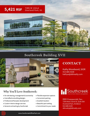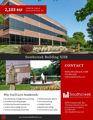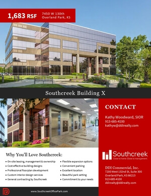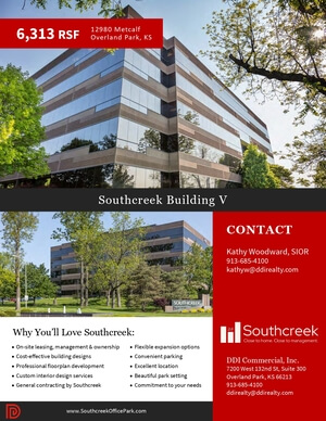 Explore premium available office space in Kansas City at Southcreek Office Park, where business meets convenience. Located in the heart of Overland Park, our thoughtfully designed office spaces offer the ideal environment for productivity and growth. Each space can be tailored to your exact specifications with our custom interior design services, ensuring that your office reflects your unique vision and brand. Whether you’re seeking a small suite or a larger workspace, our diverse options cater to all your business needs. Enjoy easy access to major highways, nearby amenities, and a vibrant professional community. Elevate your business with our exceptional Overland Park office space. Browse our listings today and find the perfect location for your team!