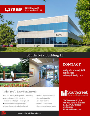 Explore premium available office space in Kansas City at Southcreek Office Park, where business meets convenience. Located in the heart of Overland Park, our thoughtfully designed office spaces offer the ideal environment for productivity and growth. Each space can be tailored to your exact specifications with our custom interior design services, ensuring that your office reflects your unique vision and brand. Whether you’re seeking a small suite or a larger workspace, our diverse options cater to all your business needs. Enjoy easy access to major highways, nearby amenities, and a vibrant professional community. Elevate your business with our exceptional Overland Park office space. Browse our listings today and find the perfect location for your team!
